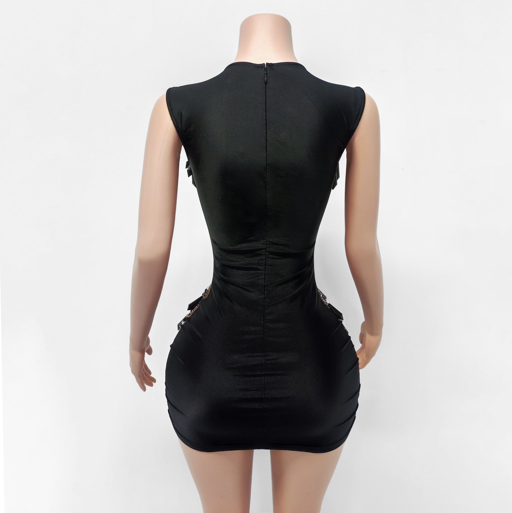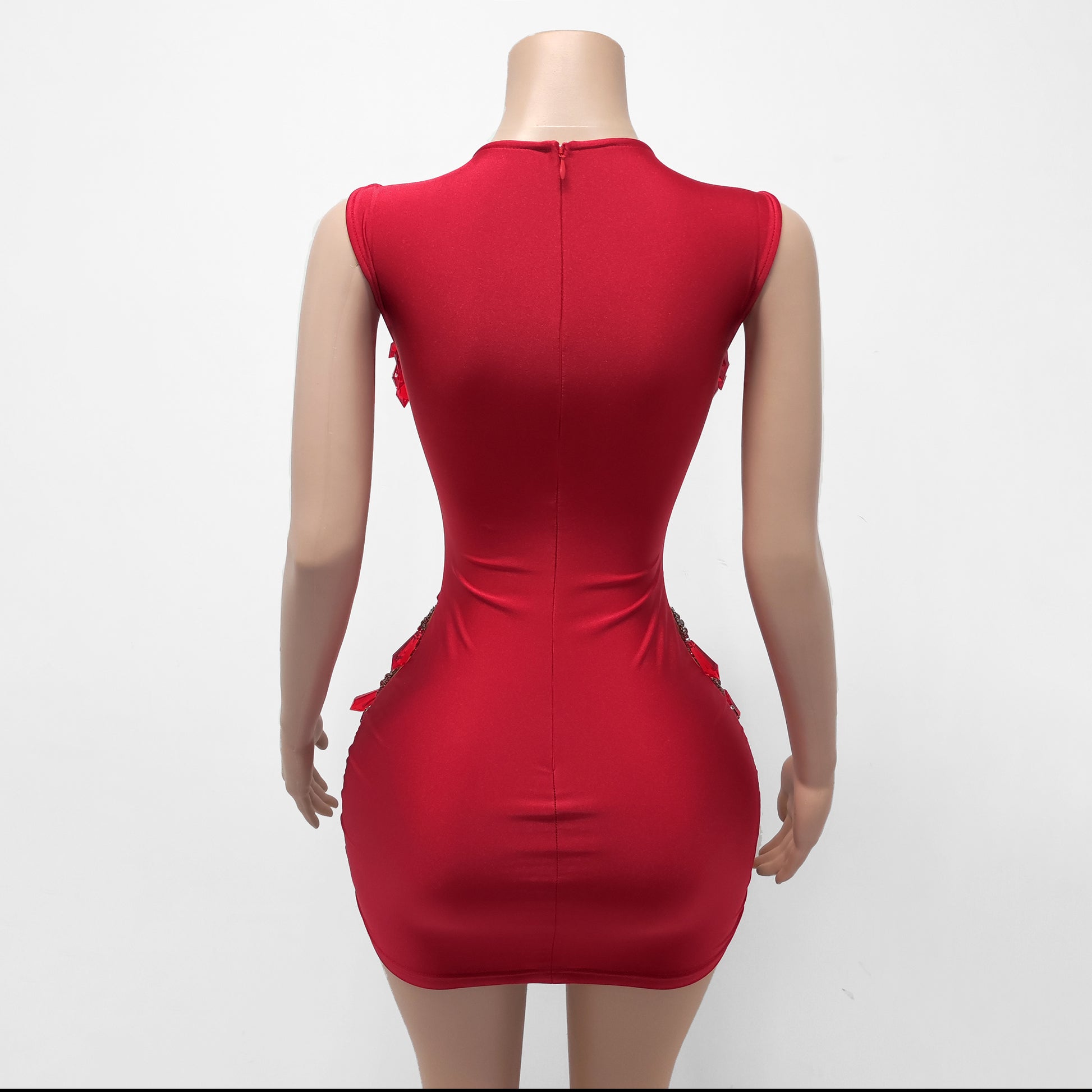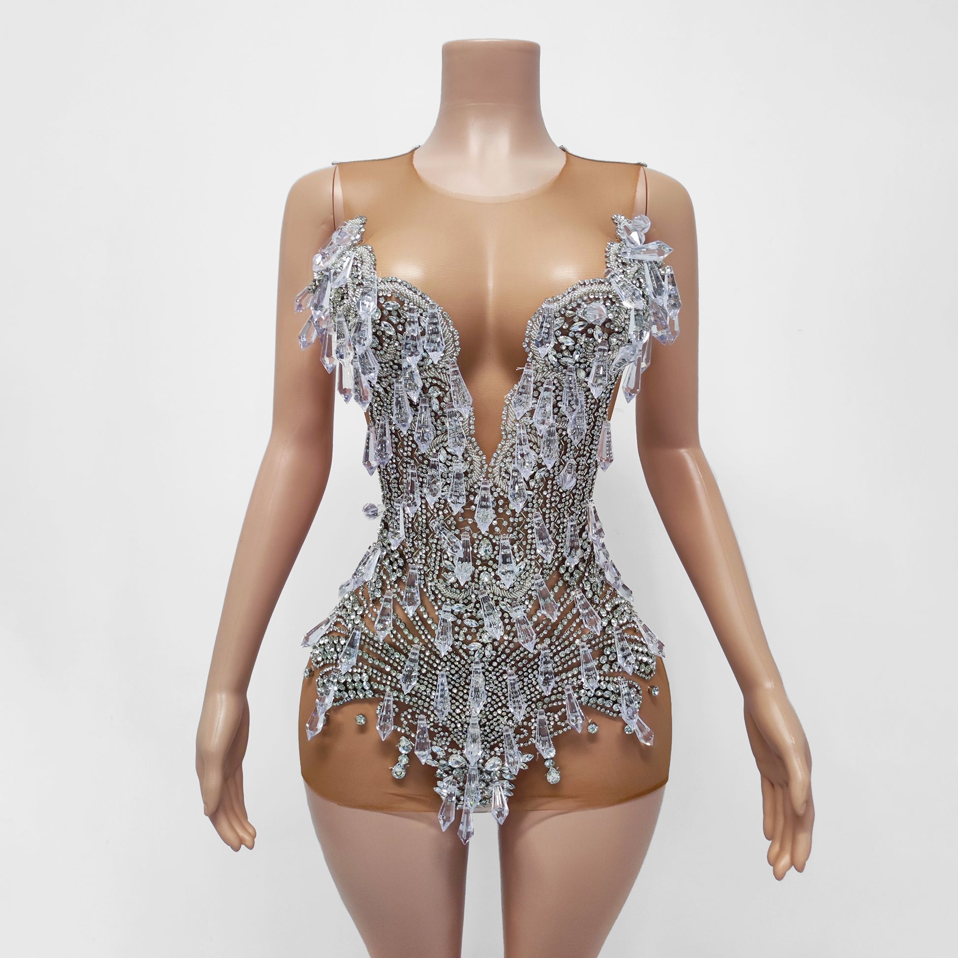 A show-stopping mesh mini dress with crystal drops and rhinestones that shimmer with every move. The sculpted fit make this the ultimate head-turner.
