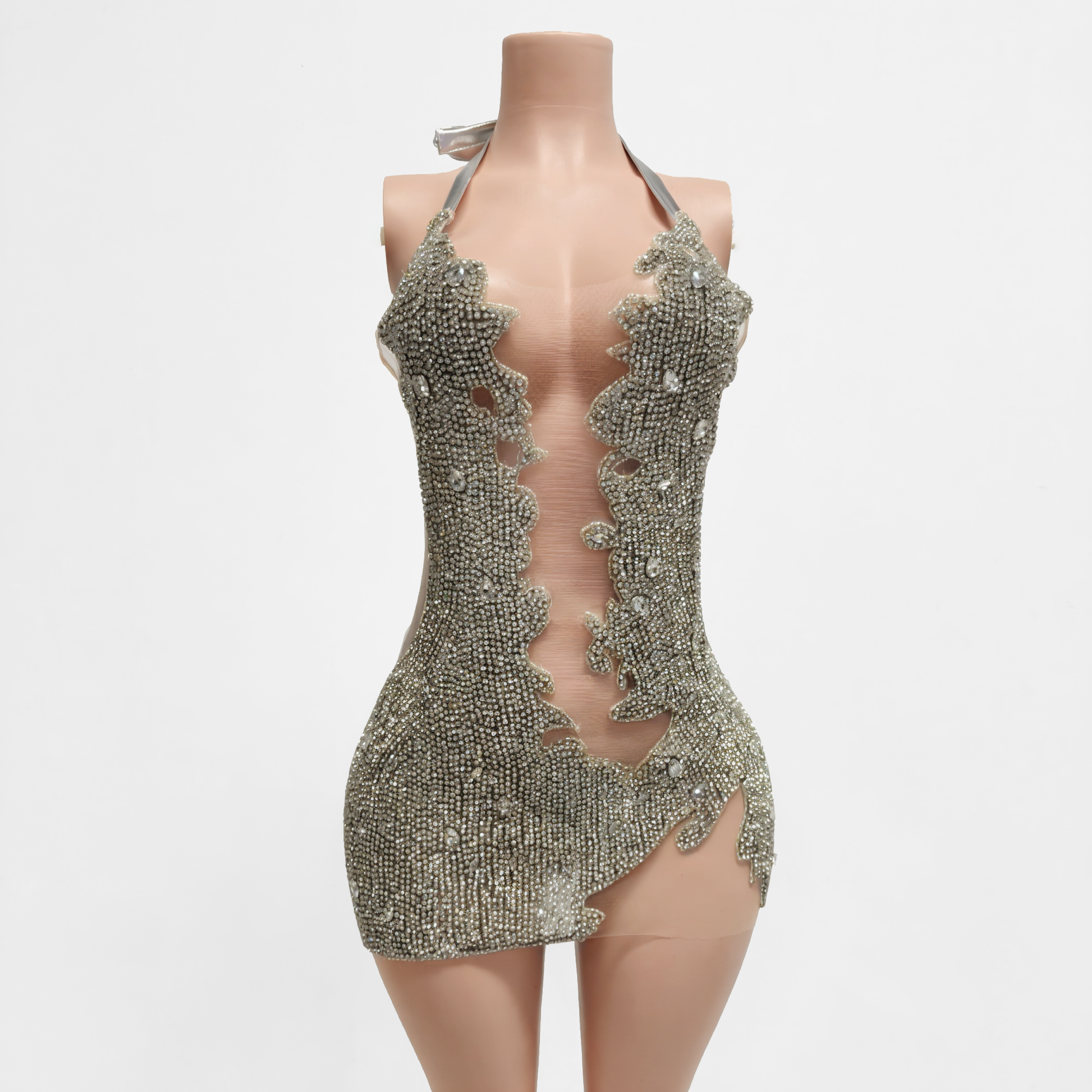 As seen on Britney Spears. This sheer, hand beaded mini dress features all over glass rhinestones, beading, and a wet look back.