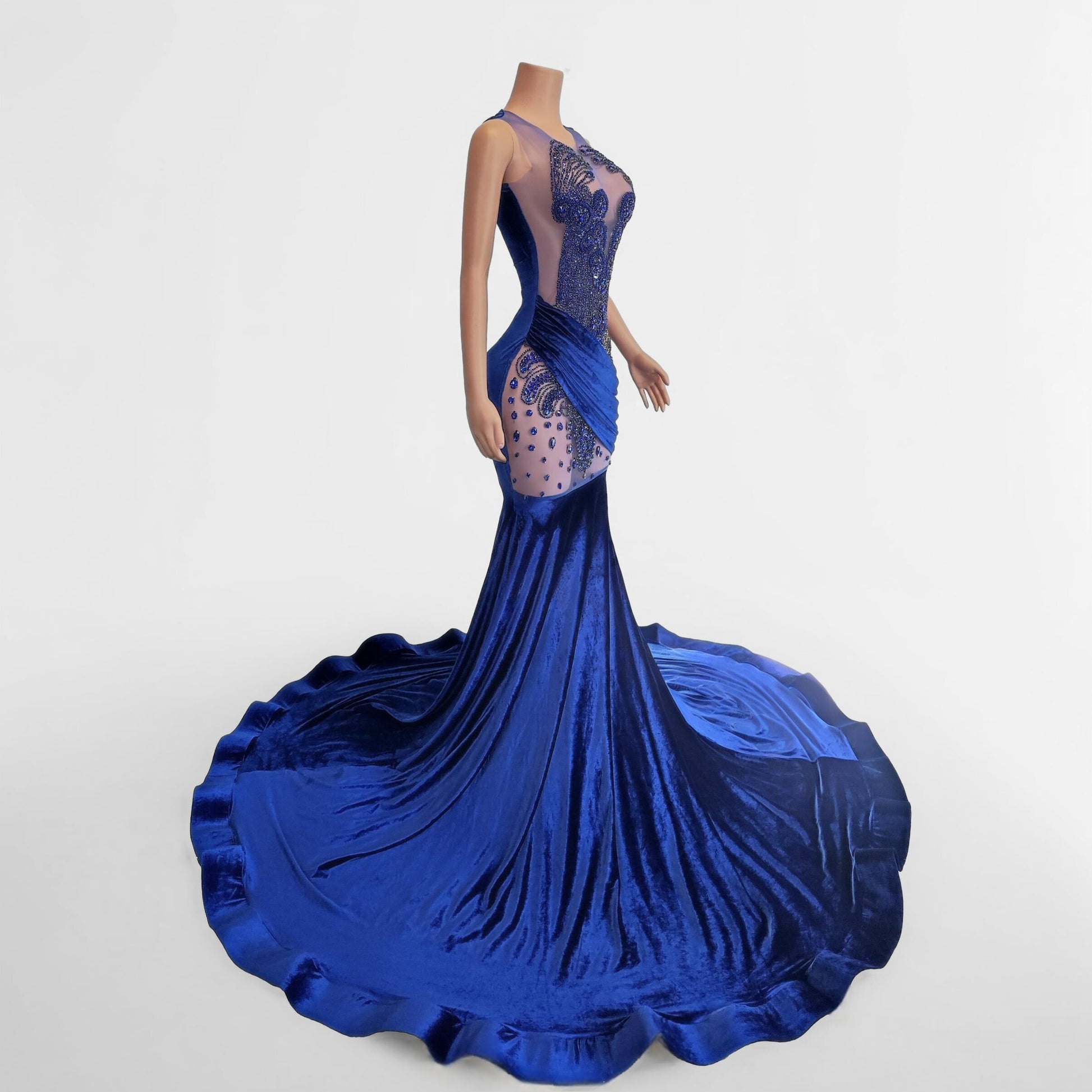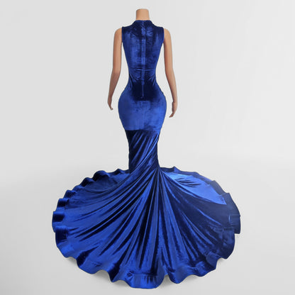 Dazzle in this gown. The intricate glass rhinestone beaded bodice screams glamour, while the beautiful velvet like fabric creates a stunning statement. Perfect for making a bold and unforgettable entrance.