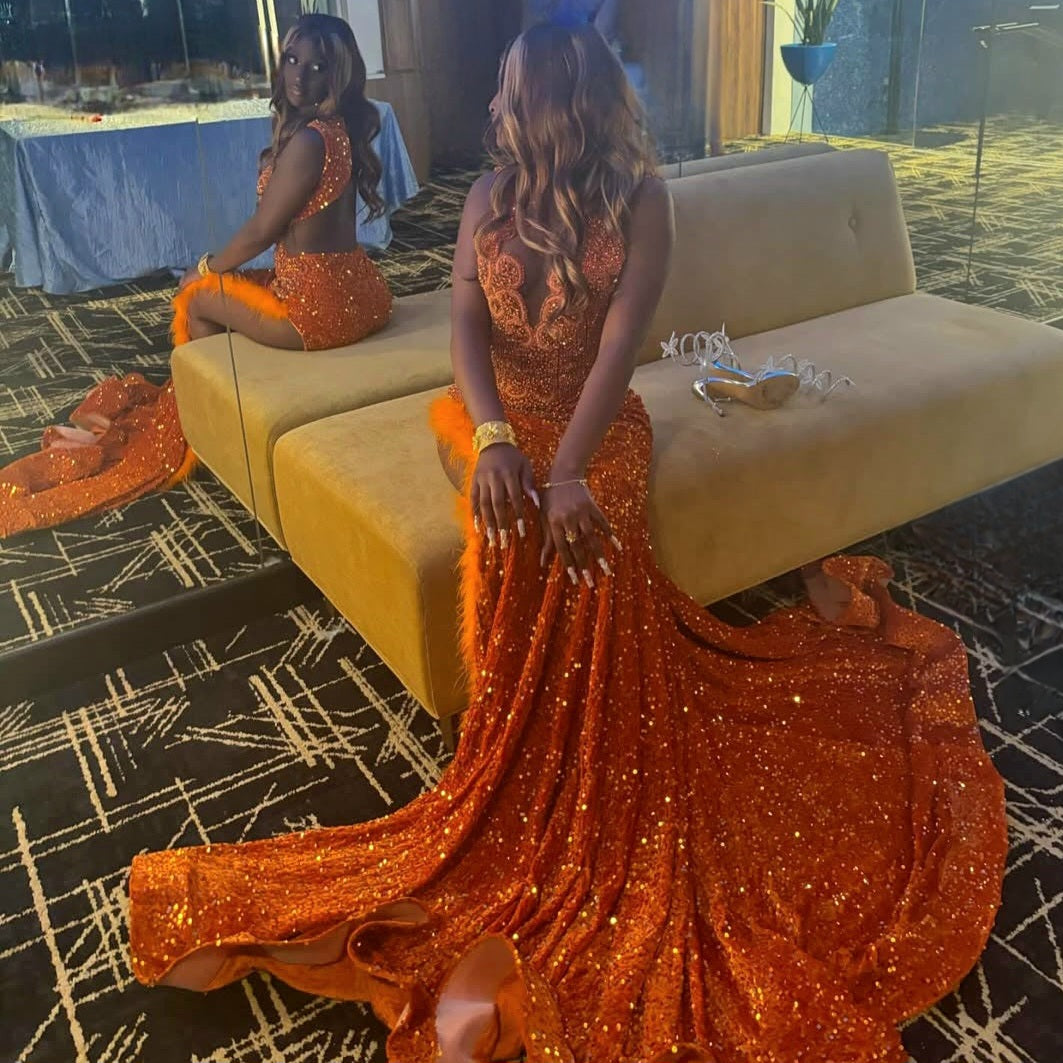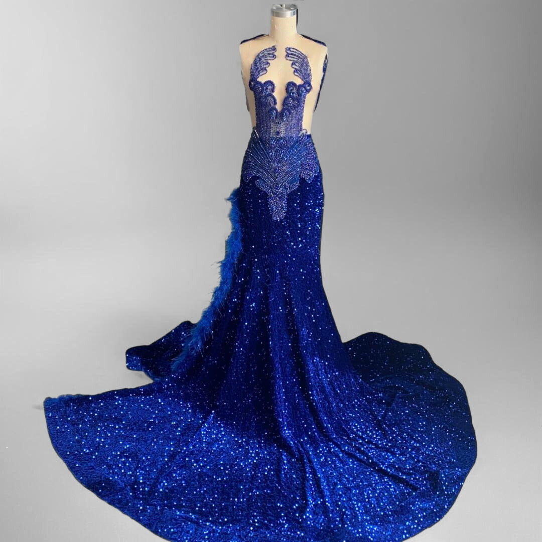 The sequin fabric bottom of the gown is a statement in itself, exuding a sense of luxury and extravagance. The side slit, gracefully adorned with feather accents, adds a touch of playfulness and drama to your look, allowing you to show off your legs and make a grand entrance.